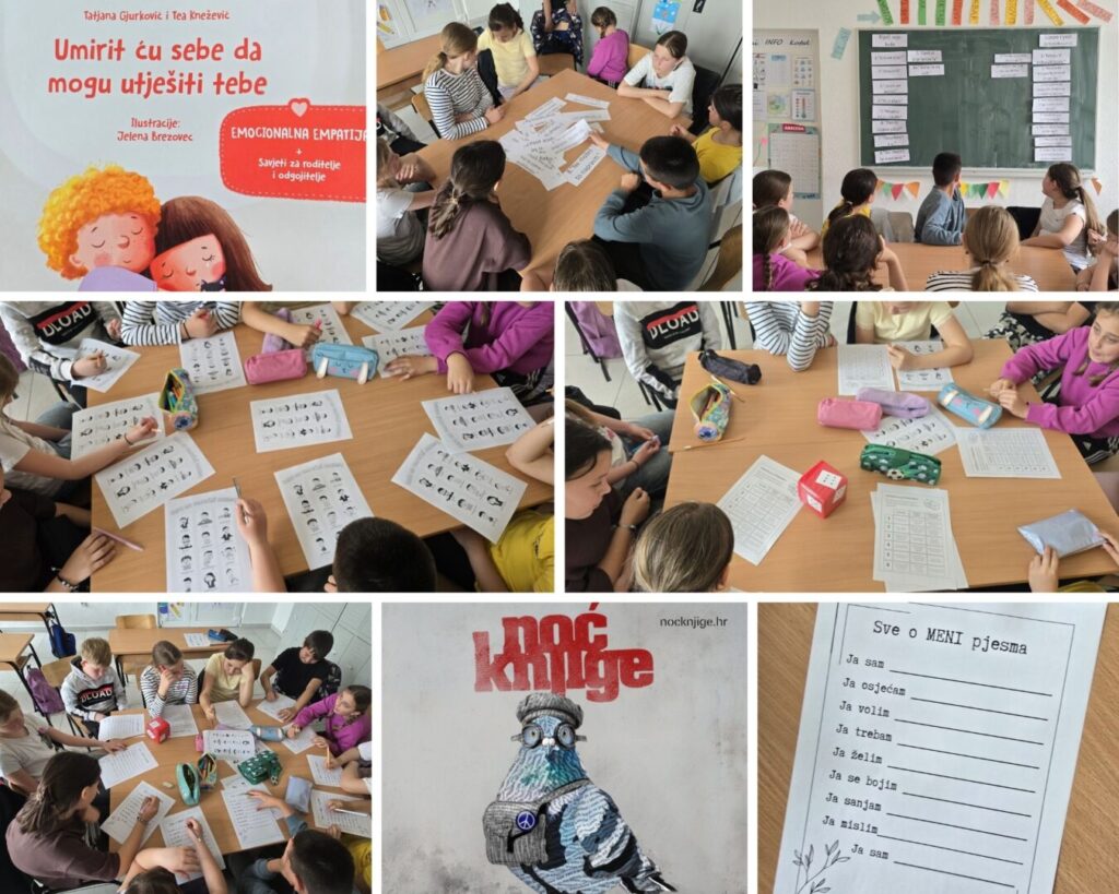 Kako bi u duhu teme potaknula učenike na bolje razumijevanje emocionalne empatije, školska knjižničarka im je pročitala knjigu autorica Tatjana Gjurković i Tea Knežević pod nazivom „Umirit ću sebe da mogu utješiti tebe“. Iako je knjiga predviđena za mlađu djecu do 7 godina i naši jedanaestogodišnjaci iz 4. razreda trebaju nekada podsjetnik da je u redu pokazati svoje osjećaje, te da je sasvim normalno da ponekad osjetimo ono što drugi osjećaju. To je ono što nazivamo empatijom. Kroz cijeli sat smo razgovarali o različitim emocijama, o težinama riječi i rečenica koje govorimo ponekad drugima, te kako nekad, ako nismo oprezni stvari koje kažemo mogu povrijediti druge. Iako učenici već par godina idu zajedno u razred kroz igru „Zarolaj i podijeli“ pokušali smo se malo bolje upoznati uz pomoć pitanja što nas usrećuje, što znači biti dobar prijatelj i sva ona pitanja koja si možda ne postavljamo toliko često, a važna su. Za kraj učenici su imali zadatak upoznati sebe pišući pjesmu „Sve o meni pjesma“.