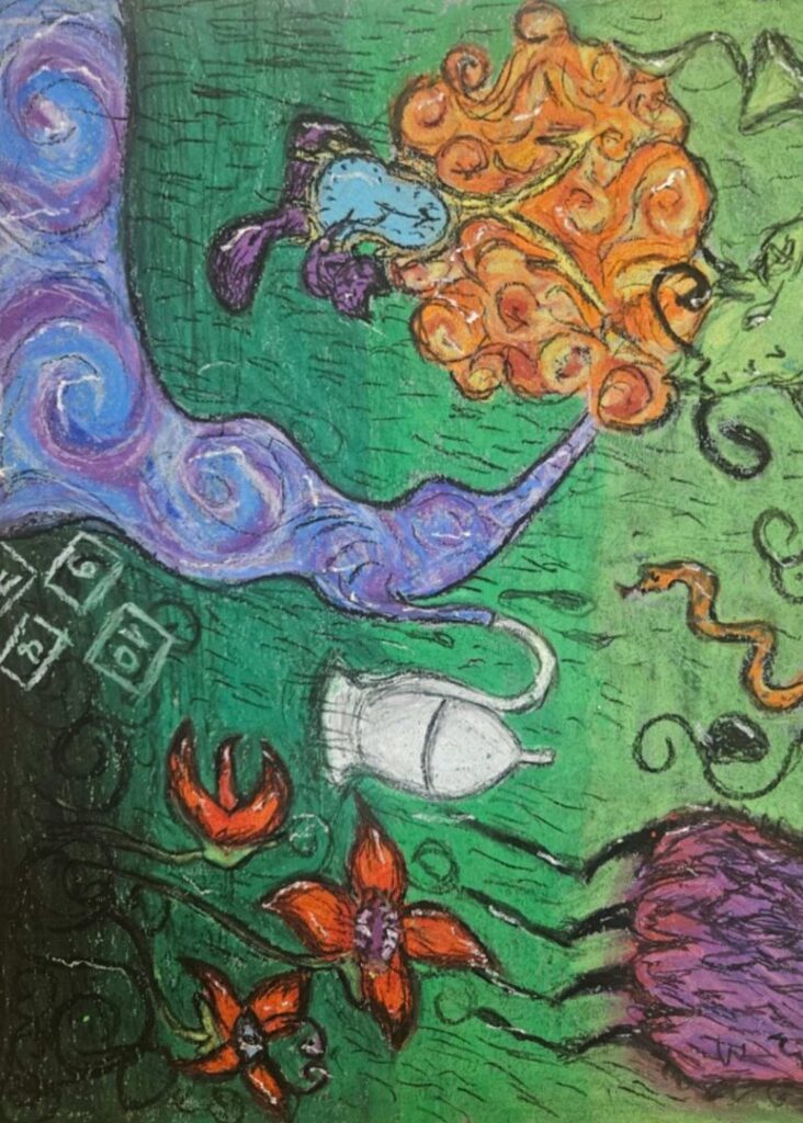 Vanessa je svoj likovni rad izvela u tehnici uljanih pastela. Osim prikaza zadane teme bilo je potrebno obuhvatiti i zadani likovni jezik: toplo-hladni kontrast, teksture i tonove boje.